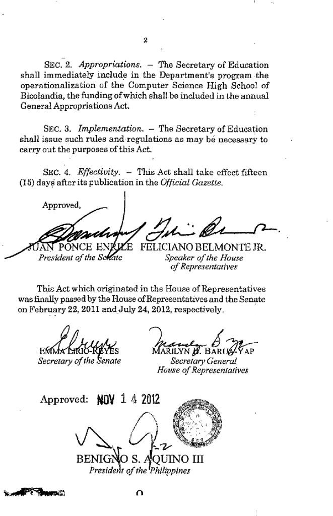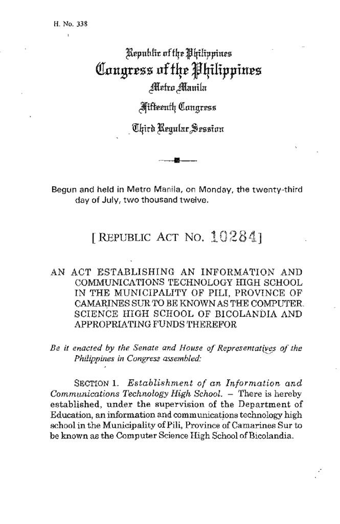 The Computer Science High School of Bicolandia was founded in 2008 through Republic Act No. 10284, a landmark legislation that formally established an ICT-oriented public high school in the province of Camarines Sur.